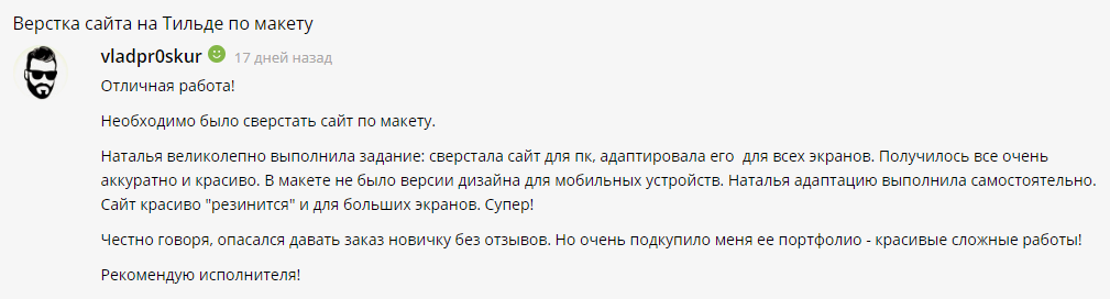 Всем привет! Я занимаюсь сайтостроением уже более 5 лет: HTML, CSS, JavaScript, PHP, MySQL, Figma, Tilda, Webflow, Wordpress. Основное направление сейчас - Тильда. Я предлагаю Вам свою помощь в верстке сайтов в данном сервисе.